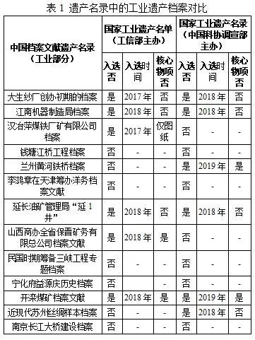 1.2 工业类档案文献遗产价值得以认识。随着世界各地文献遗产保护的认识不断深入,1992 年国际教科文组织设立“世界记忆项目”(Memory of the World Programme),[11]旨在以最合适的技术保存世界文献遗产、促进文献遗产的普遍获取、提高全世界对文献遗产存在和重要性的认识。而这一举措也极大推动了我国对包括图书馆和档案馆保存的文件、手稿及口述历史记录等文献的认知转变,开始从文化遗产的视角认识档案的重要价值。2000年,为积极响应号召,由国家档案局负责牵头的中国档案文献遗产工程组织正式启动,并建立了《中国档案文献遗产名录》 。而在随后入选《中国档案文献遗产名录》的档案文献中,大生纱厂创办初期的档案、江南机器制造局档案、汉冶萍煤铁厂矿有限公司档案、钱塘江桥工程档案、兰州黄河铁桥档案、李鸿章在天津筹办洋务档案文献、延长油矿管理局“延1井”(陆上第一口油井)专题档案、山西商办全省保晋矿务有限总公司档案文献、民国时期筹备三峡工程专题档案、宁化府益源庆历史档案、开滦煤矿档案文献、近现代苏州丝绸样本档案、南京长江大桥建设档案等见证着我国工业发展进程的档案开始受到学界和社会的专门性关注。而将入选《中国档案文献遗产名录》中的工业遗产档案与入选《国家工业遗产名单》(由工信部主办,共五批)、《国家工业遗产名录》(由中国科协调宣部主办,共两批)的工业遗产及其核心物项进行对比,如表1所示。可以发现,《中国档案文献遗产名录》中的工业遗产档案大部分尚未被纳入工业遗产的核心物项之中,成为完善工业遗产名录及其核心物项的重要补充。