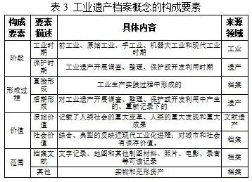 2.2 工业遗产档案的构成要素。鉴于目前尚未发布与工业遗产档案有关的政策文本,本研究主要尝试通过对相关研究成果中工业遗产档案的定义进行梳理,并结合上述工业遗产的概念,归纳工业遗产档案内涵的构成要素,如表3所示。