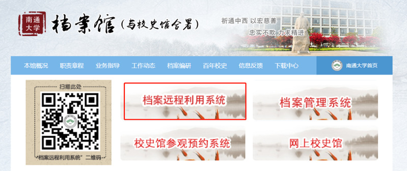登录南通大学档案馆官方网站(/),点击“档案远程利用系统”或扫描二维码进入。