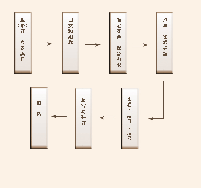 档案立卷程序包括拟(修订)立卷类目、归类和组卷、确定案卷的保管期限、拟写案卷标题、案卷的编目与编号、填写与装订、归档等七个工作流程(见档案立卷程序流程图)。